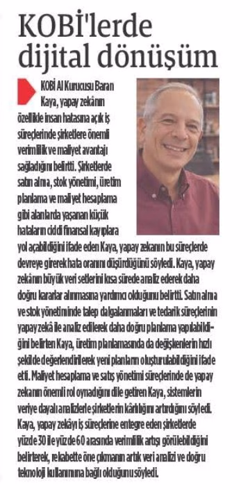 KOBİ AI Kurucusu Baran Kaya, yapay zekânın özellikle insan hatasına açık iş süreçlerinde şirketlere önemli verimlilik ve maliyet avantajı sağladığını belirtti. Şirketlerde satın alma, stok yönetimi, üretim planlama ve maliyet hesaplama gibi alanlarda yaşanan küçük hataların ciddi finansal kayıplara yol açabildiğini ifade eden Kaya, yapay zekânın bu süreçlerde devreye girerek hata oranını düşürdüğünü söyledi. Kaya, yapay zekânın büyük veri setlerini kısa sürede analiz ederek daha doğru kararlar alınmasına yardımcı olduğunu belirtti. Satın alma ve stok yönetiminde talep dalgalanmaları ve tedarik süreçlerinin yapay zekâ ile analiz edilerek daha doğru planlama yapılabildiğini belirten Kaya, üretim planlamasında da değişkenlerin hızlı şekilde değerlendirilerek yeni planların oluşturulabildiğini ifade etti. Maliyet hesaplama ve satış yönetimi süreçlerinde de yapay zekânın önemli rol oynadığını dile getiren Kaya, sistemlerin veriye dayalı analizlerle şirketlerin kârlılığını artırdığını söyledi. Kaya, yapay zekâyı iş süreçlerine entegre eden şirketlerde yüzde 30 ile yüzde 60 arasında verimlilik artışı görülebildiğini belirterek, rekabette öne çıkmanın artık veri analizi ve doğru teknoloji kullanımına bağlı olduğunu söyledi.